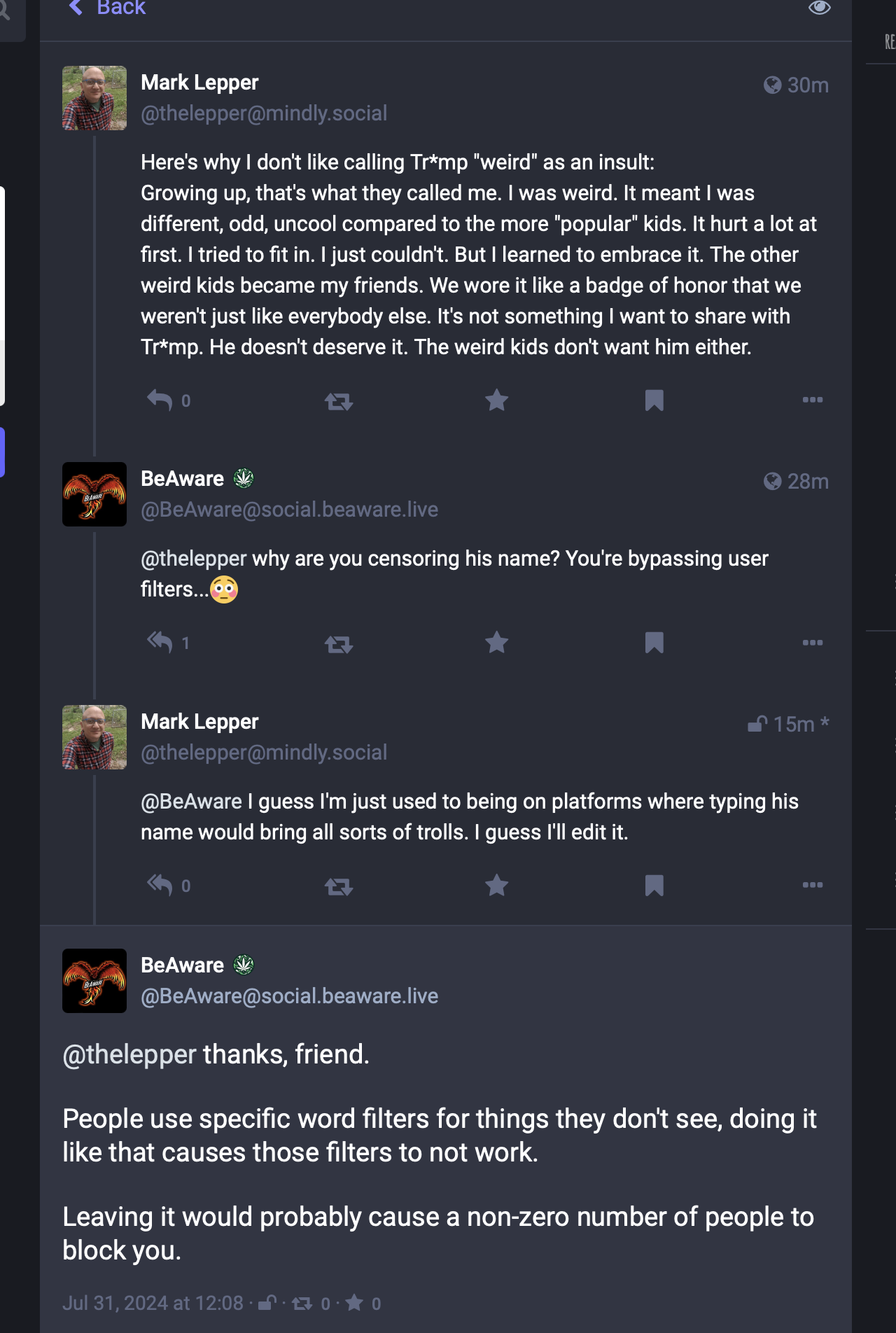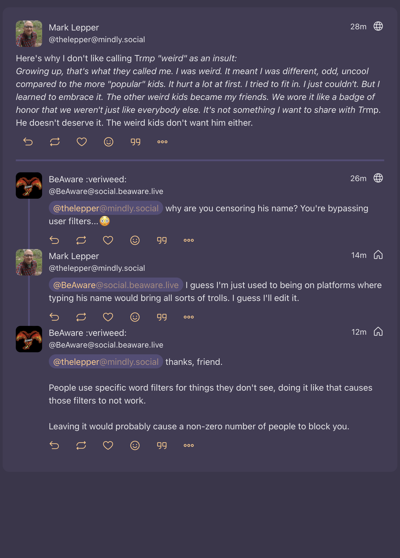 See below pictures. Sorry, they are political but it's just a random toot I picked out. I'll make a feature request for word filters soon...